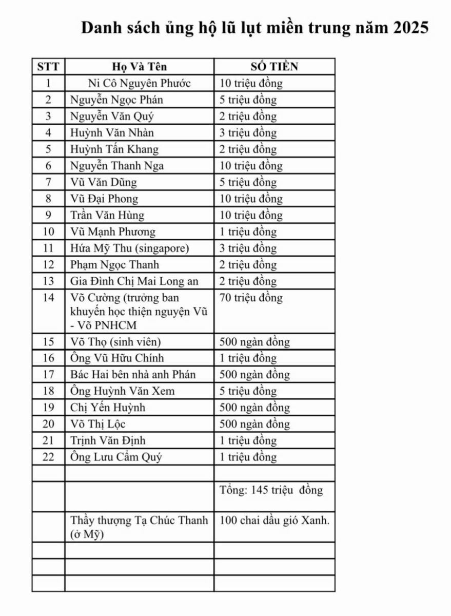 Trên đây, là đợt vận động ủng hộ bà con bị ảnh hưởng lũ lụt miền Trung đợt 1, Ban Lãnh đạo HĐDH.Vũ-Võ Phương Nam-TP.HCM chuẩn bị phát động ủng hộ đợt 2, rất mong Quý vị ủng hộ giúp đỡ.