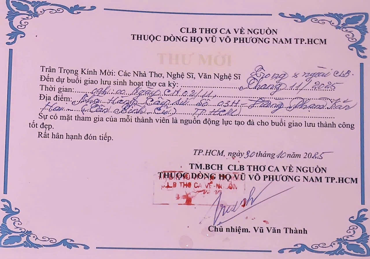 Sáng ngày 02-11-2025, CLB.Thơ ca “Về Nguồn”, trực thuộc HĐDH.Vũ-Võ Phương Nam-TP.HCM tổ chức sinh hoạt thường kỳ tháng 11, tại phòng Vip 3, nhà hàng Cây Sứ, phường Tân Sơn Hoà, TP.HCM. Buổi sinh hoạt diễn ra một cách rất vui vẻ, ấm áp tình dòng tộc với những bài thơ ca về tình yêu tổ quốc, gia đình, dòng họ…