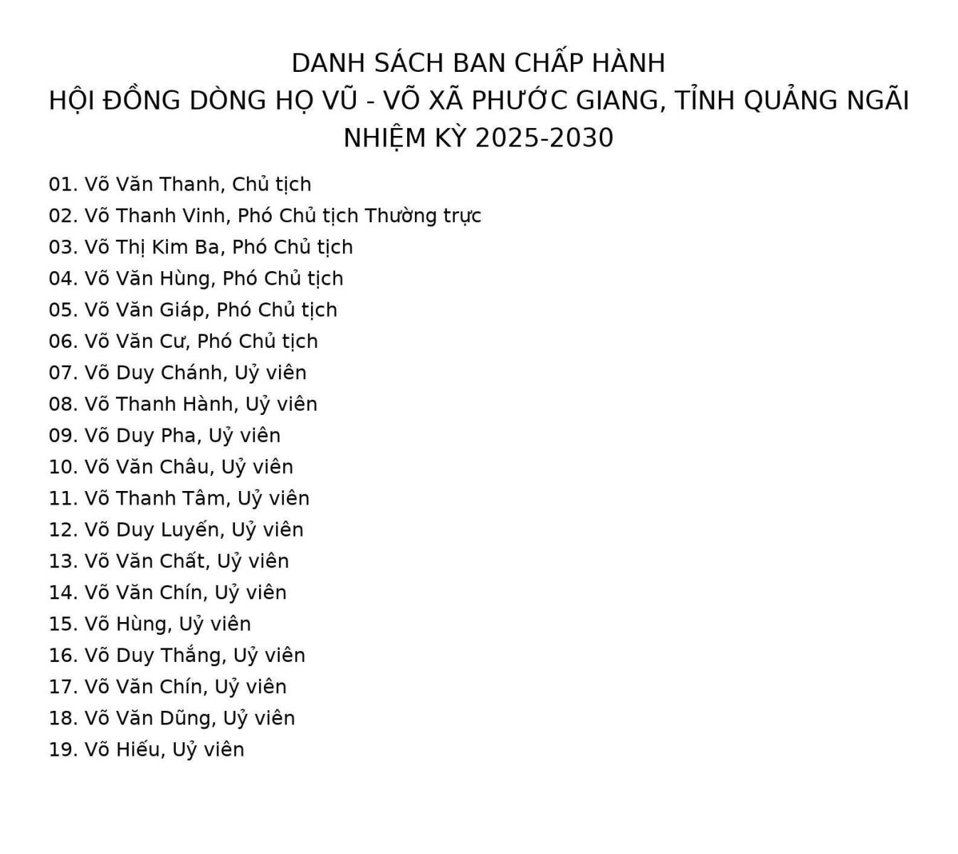 - Danh sách Ban Chấp hành và Nghị quyết của Hội nghị Hội đồng Dòng họ Vũ - Võ xã Phước Giang lần thứ I, nhiệm kỳ 2025-2030.