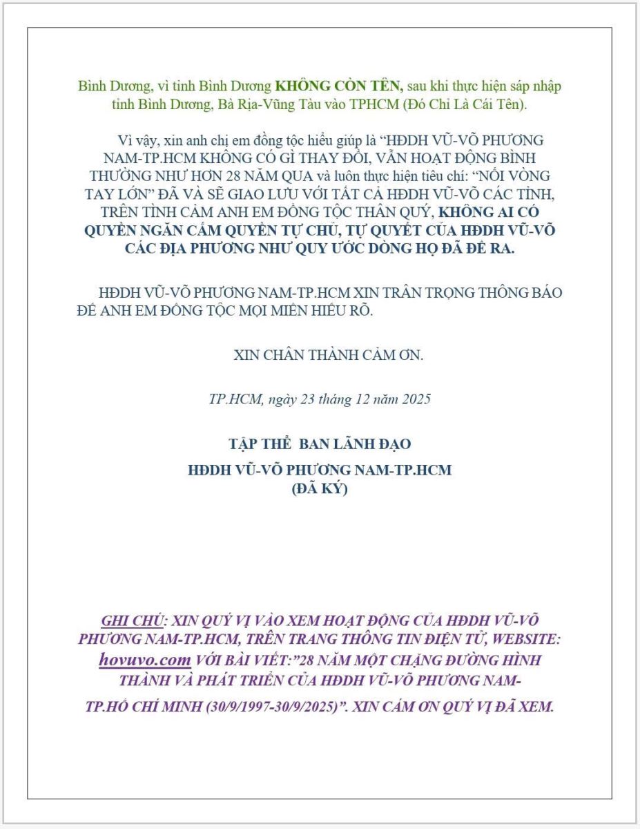 THÔNG BÁO CỦA HĐDH VŨ-VÕ PHƯƠNG NAM-TP.HỒ CHÍ MINH: VỀ VIỆC LỄ THÀNH LẬP BCH LÂM THỜI DÒNG HỌ VŨ-VÕ TP,HCM, NGÀY 28-12-2025.