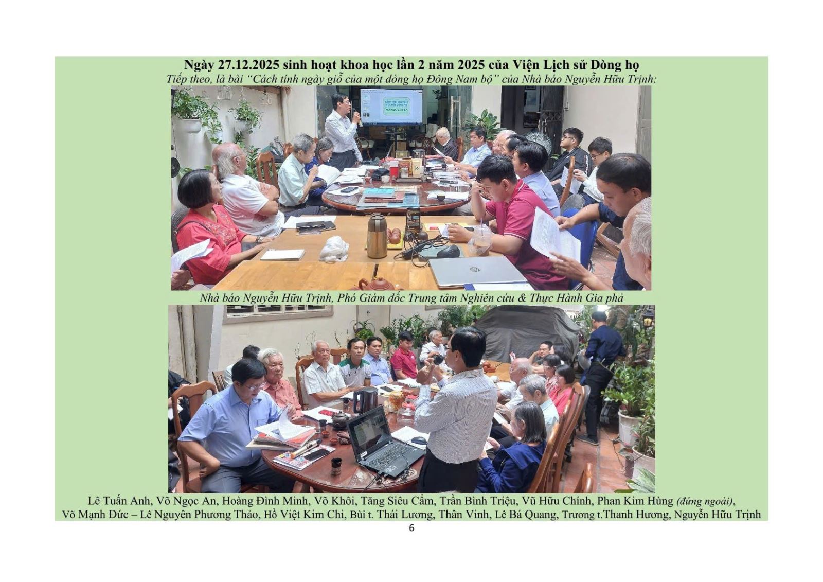 Sáng 27-12-2025, Hội đồng Viện Lịch sử Dòng họ tổ chức: Sinh hoạt Khoa học lần thứ 2 năm 2025, tại số 4 Bà Huyện Thanh Quan, phường Xuân Hòa, TP.HCM, do PGS.TS Võ Văn Lộc-Phó Viện trưởng chủ trì. Đến dự có đại diện các dòng họ: Ô.Vũ Hữu Chính-PCT.HĐDH Vũ-Võ Phương Nam-TP.HCM; Ô.Thân Vinh-CT.HĐ Thân tộc miền Nam; Ô.Tăng Siêu Cẩm-CT.họ Tăng TP.HCM; Ô.Võ Mạnh Đức-UV.BCH Mạc tộc TP.HCM…Các thành viên của Viện Lịch sử Dòng họ và Trung tâm Nghiên cứu và Thực hành Gia phả TP.HCM, CLB Gia phả Trẻ…