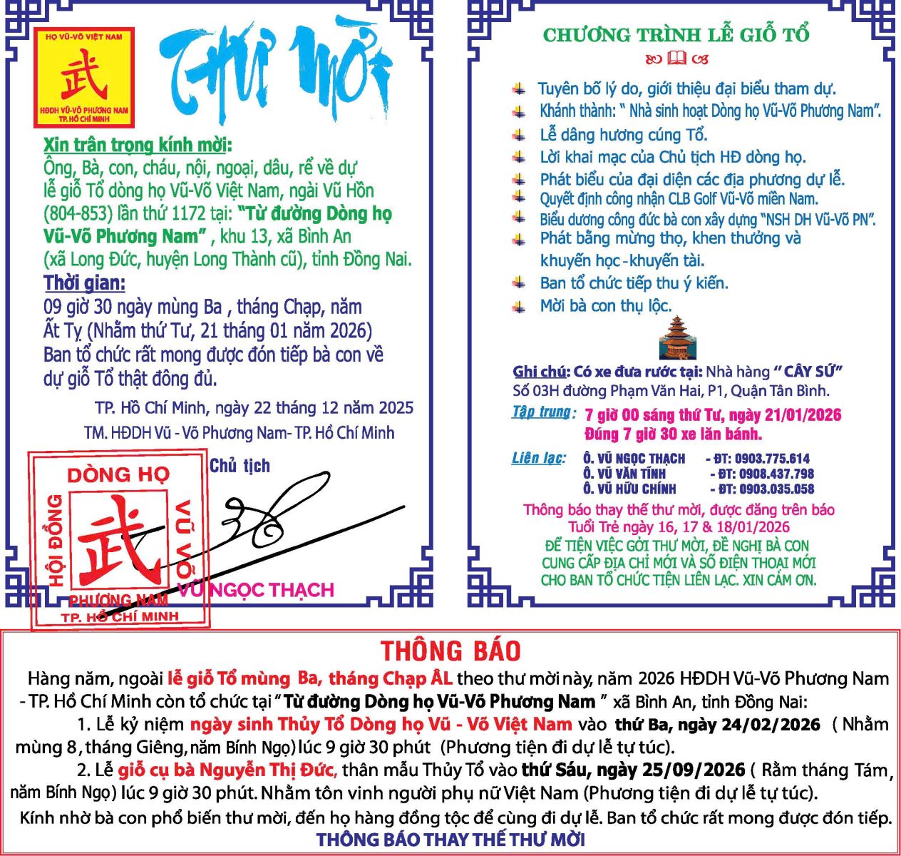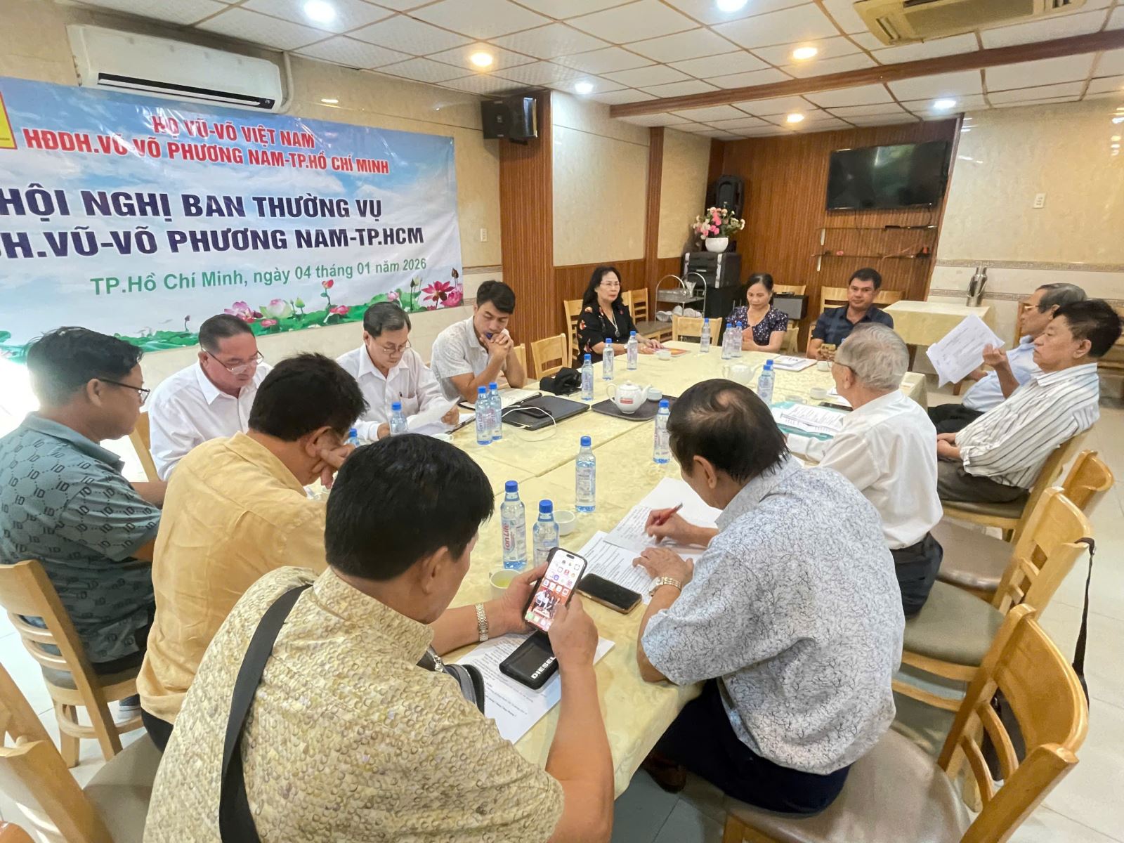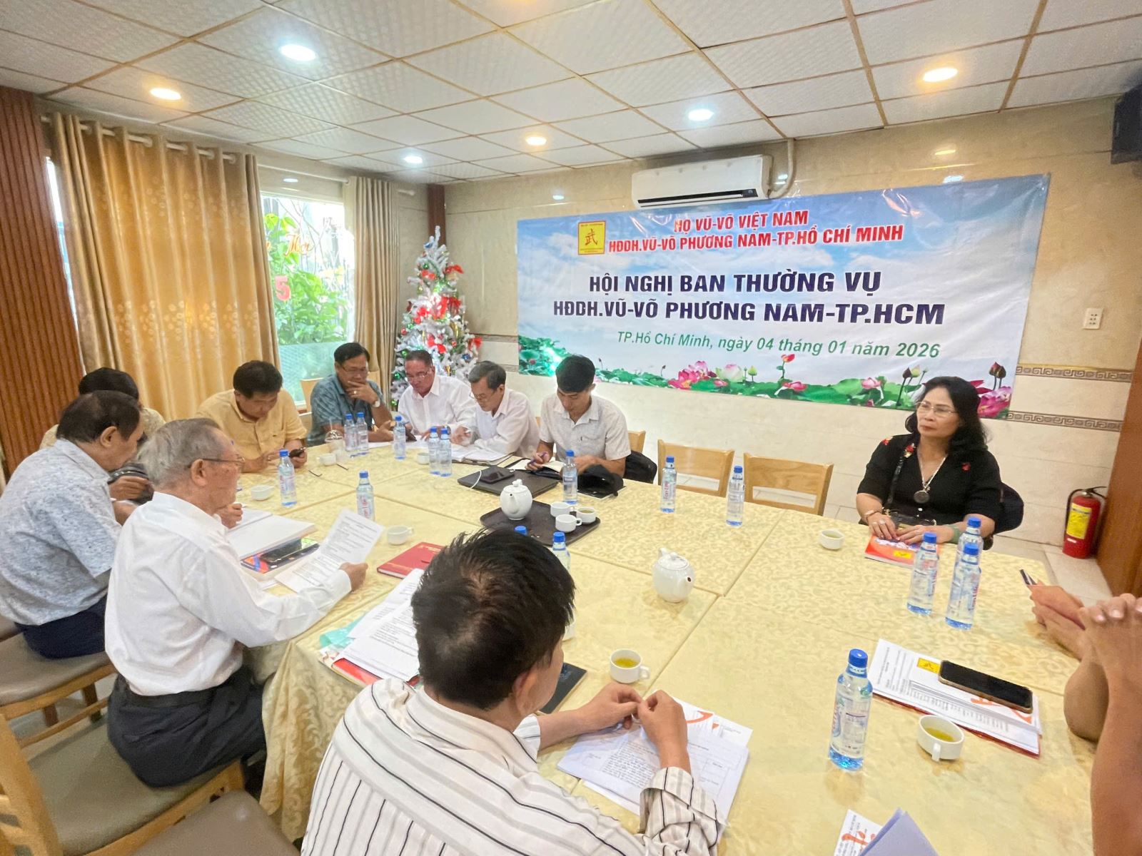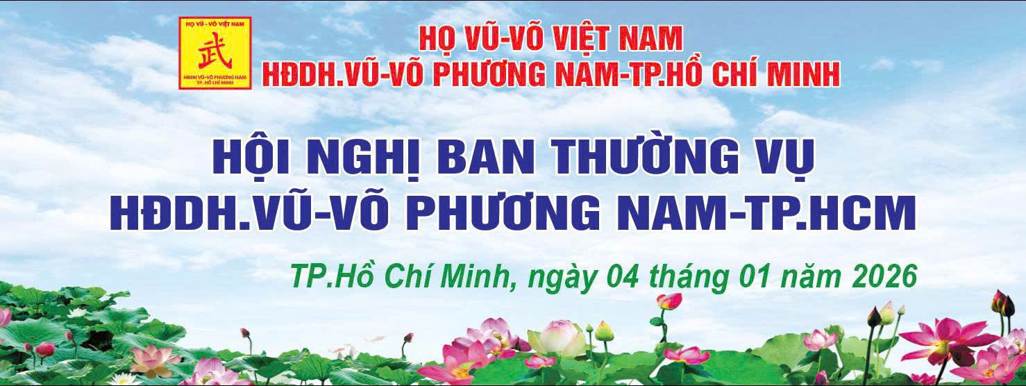 Chiều 04-01-2026, tại phòng Vip 2, nhà hàng Cây Sứ, Hội nghị Ban Thường vụ HĐDH.Vũ-Võ Phương Nam-TP.HCM, đã họp bàn về việc chuẩn bị tổ chức lễ giỗ Thuỷ Tổ, ngày 21-01-2026 (Nhằm mùng Ba, tháng Chạp, năm Ất Tỵ) tại: “Từ đường Dòng họ Vũ-Võ Phương Nam”, đường Nguyễn Thị Giờ, khu 13, xã Bình An (Long Đức, Long Thành cũ), tỉnh Đồng Nai. Đến dự có các vị: Vũ Ngọc Thạch-Chủ tịch; 03 Phó Chủ tịch: Vũ Văn Dũng (TT), Vũ Hường, Vũ Hữu Chính; UV.BTV: Vũ Kế Hoạch, Vũ Mạnh Phương, Vũ Ngọc Hoa, Vũ Ngọc Quý, Vũ Văn Huấn, Nguyễn Văn Minh, Vũ Văn Chữ, Vũ Xuân Hoài, Võ Cường, Võ Thị Phượng và Vũ Văn Mạnh.