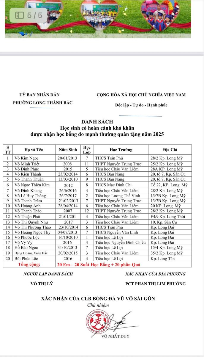 Sau đó, CLB.Bóng đá Vũ-Võ Sài Gòn do ông Võ Nhất Duy-Chủ nhiệm cùng ACE trong BCN đã phát quà cho 20 em học sinh có hoàn cảnh khó khăn ngụ tại phường Long Thành Bắc (Có danh sách đính kèm).