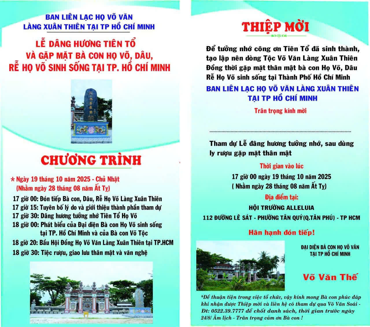 Chiều ngày 19-10-2025, nhận lời mời của đại diện chi họ Võ Văn, gốc làng Xuân Thiên, TP Huế, đang làm việc, học tập sinh sống tại TP. Hồ Chí Minh. Ông Vũ Ngọc Thạch-Chủ tịch HĐDH Vũ-Võ Phương Nam-TP.HCM, thay mặt Ban Lãnh đạo đến dự.