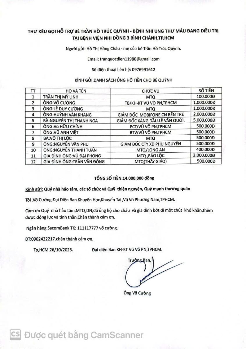 Chiều ngày 27-10-2025, đại diện Ban Lãnh đạo HĐDH Vũ-Võ Phương Nam-TP.HCM, ông Vũ Ngọc Thạch-Chủ tịch  và ông Võ Cường-UV. Ban Thường vụ, Trưởng ban Khuyến học-Thiện nguyện đã đến bệnh viện Nhi Đồng, tại số 15 Võ Trần Chí, huyện Bình Chánh để trao số tiền trên cho Ba, Mẹ cháu Trần Hồ Trúc Quỳnh.