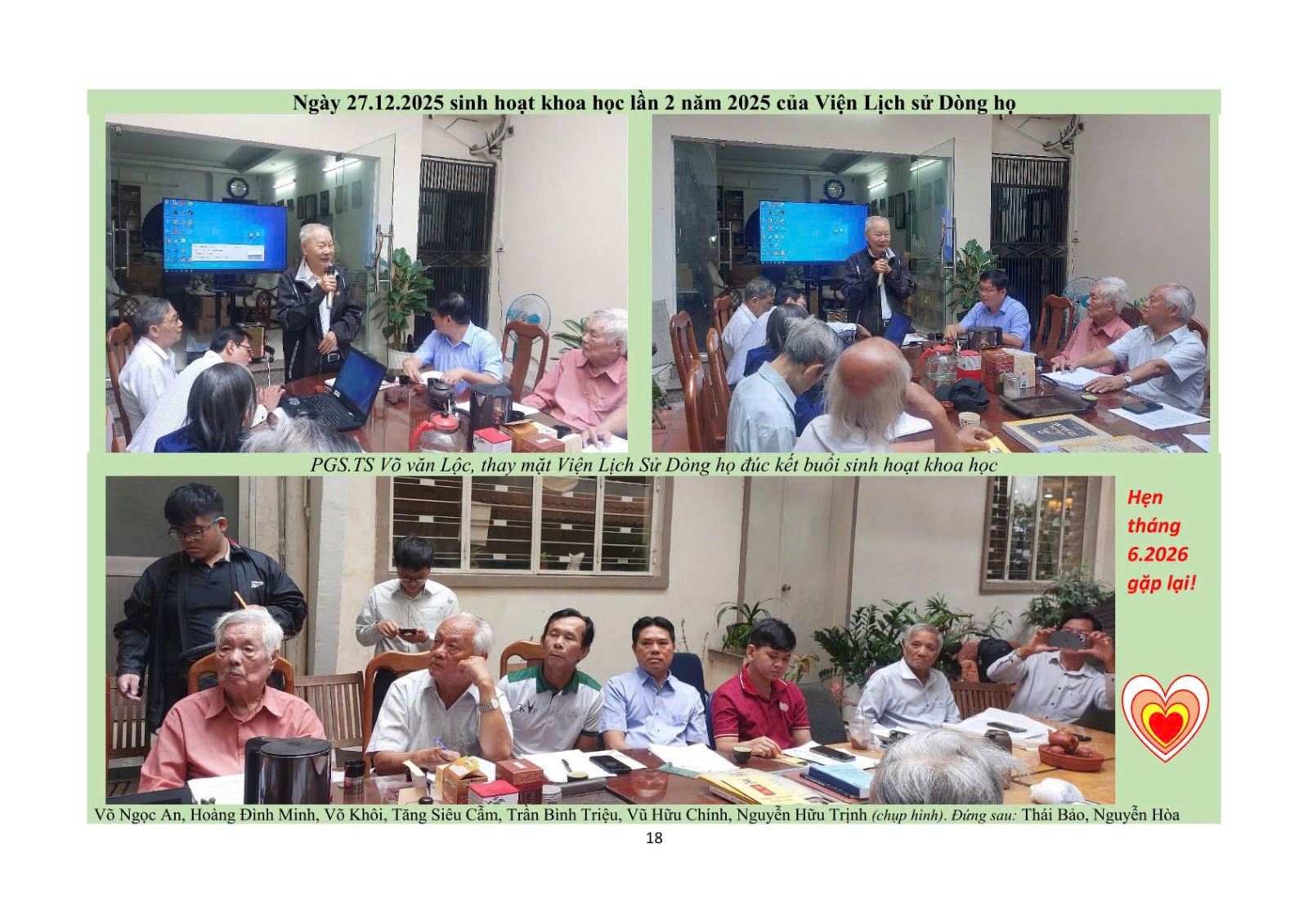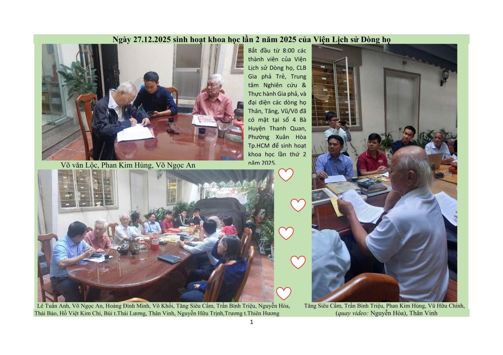 Sáng 27-12-2025, Hội đồng Viện Lịch sử Dòng họ tổ chức: Sinh hoạt Khoa học lần thứ 2 năm 2025, tại số 4 Bà Huyện Thanh Quan, phường Xuân Hòa, TP.HCM, do PGS.TS Võ Văn Lộc-Phó Viện trưởng chủ trì. Đến dự có đại diện các dòng họ: Ô.Vũ Hữu Chính-PCT.HĐDH Vũ-Võ Phương Nam-TP.HCM; Ô.Thân Vinh-CT.HĐ Thân tộc miền Nam; Ô.Tăng Siêu Cẩm-CT.họ Tăng TP.HCM; Ô.Võ Mạnh Đức-UV.BCH Mạc tộc TP.HCM…Các thành viên của Viện Lịch sử Dòng họ và Trung tâm Nghiên cứu và Thực hành Gia phả TP.HCM, CLB Gia phả Trẻ…