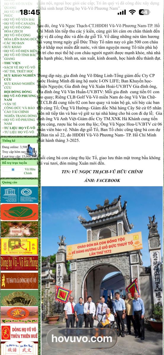 Sáng ngày 26-01-2026, trang Thông tin Điện tử (Website): hovuvo. com do HĐDH.Vũ-Võ Phương Nam-TP.HCM sáng lập & quản lý vào ngày 06-6-2006, tại TP.Hồ Chí Minh đã đạt được con số có: 15.000.000 (Mười lăm triệu) lượt người truy cập vào xem các hoạt động của Dòng họ Vũ-Võ chúng ta. Ban Biên tập trang: hovuvo.com xin chân thành cám ơn Bà con đã truy cập và trân trọng được giới thiệu đến quý vị.